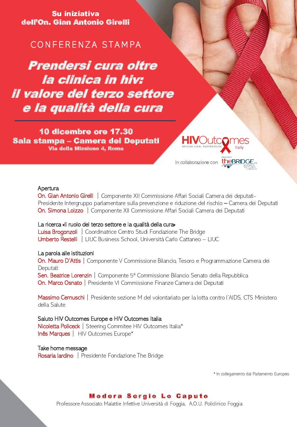 Mercoledì 10 dicembre 2025, alle ore 17,30, presso la Sala Stampa della Camera dei deputati, in Via della Missione 4, si terrà, su iniziativa del deputato Gian Antonio Girelli, la conferenza stampa “Prendersi cura oltre la clinica in HIV: il valore del terzo settore e la qualità della cura”, promossa da HIV Outcomes Italia in collaborazione con Fondazione The Bridge.