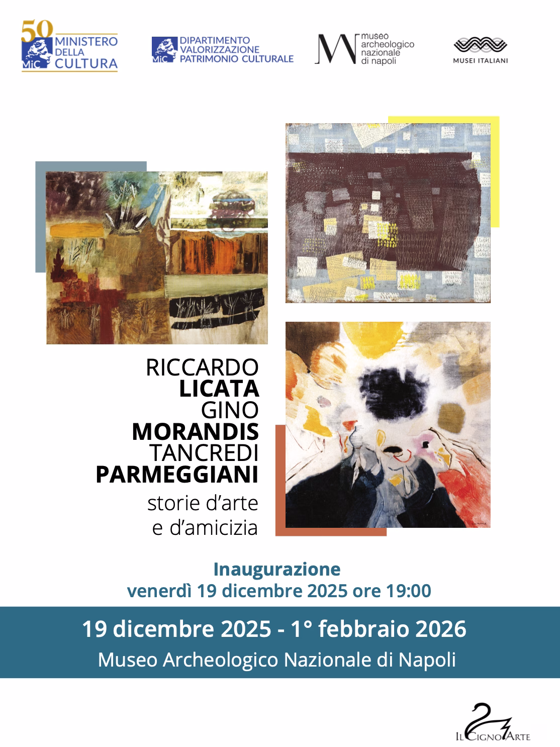 Il Museo Archeologico Nazionale di Napoli inaugura, venerdì 19 dicembre alle ore 19.00, la mostra “Tancredi Parmeggiani, Gino Morandis, Riccardo Licata. Storie d’arte e d’amicizia”, organizzata da Il Cigno Arte di Lorenzo Zichichi in collaborazione con Studio GR. L’esposizione riunisce quarantadue opere e racconta l’incontro tra tre protagonisti dell’Astrattismo italiano del Dopoguerra, legati da affinità artistiche, frequentazioni comuni e rapporti personali.