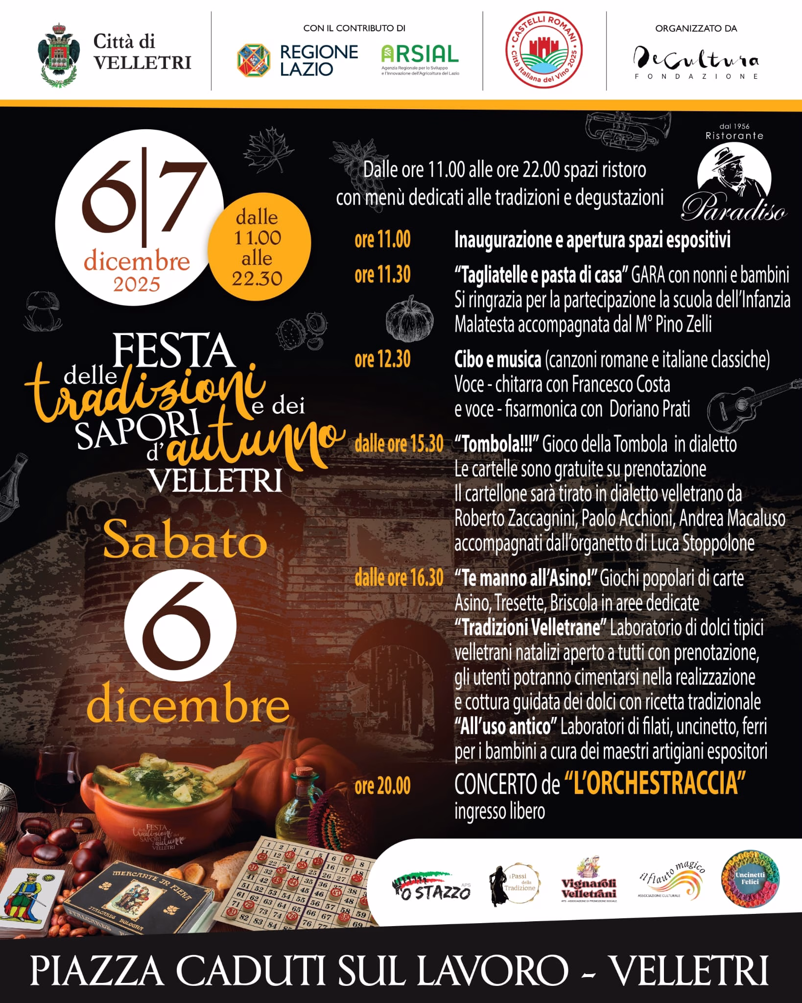 Arriva a Velletri la “Festa delle Tradizioni e dei Sapori d’Autunno”, in programma sabato 6 e domenica 7 dicembre 2025, dalle ore 11 alle 22, in Piazza Caduti sul Lavoro. Un evento imperdibile all’insegna della cultura popolare, del buon cibo e dell’identità locale, promosso dal Comune di Velletri, con il contributo di Regione Lazio e ARSIAL, nell’ambito del progetto “Castelli Romani. Destinazione di gusto”. A organizzare l’iniziativa è la Fondazione De Cultura, in collaborazione con realtà del territorio come O’ Stazzo, i Passi della Tradizione, Vignaroli Velletrani, Ristorante Paradiso e Il Flauto Magico.