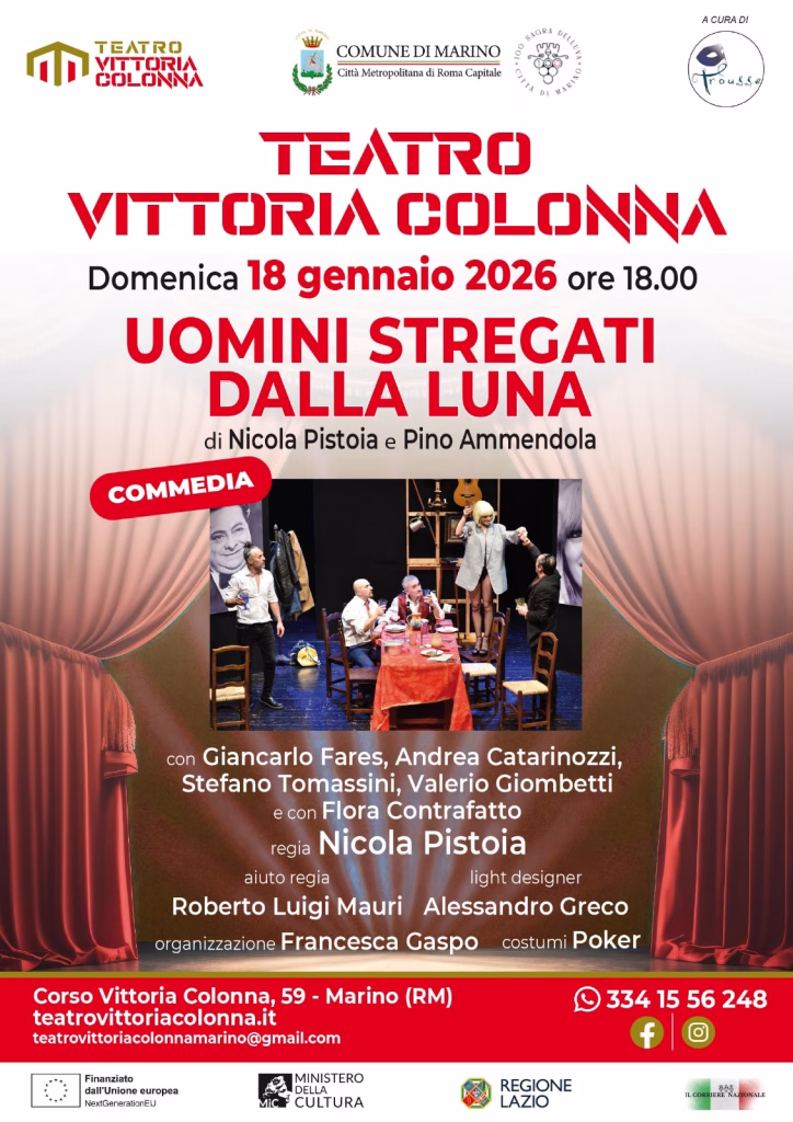 Domenica 18 gennaio 2026 alle ore 18,00 andrà in scena al Teatro V. Colonna di Marino la commedia “Uomini stregati dalla luna” di Nicola Pistoia e Pino Ammendola.